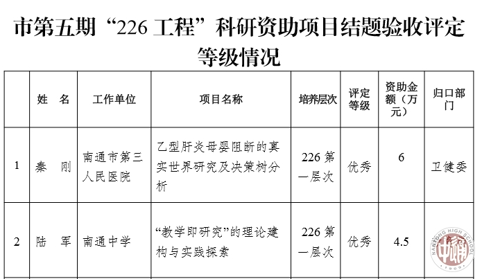 为加强对市“226工程”培养对象科研资助项目的管理,进一步提高项目资助绩效,根据《南通市第五期“226高层次人才培养工程”培养对象选拔培养与管理办法》(通委人才办〔2016〕13号),经各县(市)区和市各有关部门组织培养对象申请、专家结题验收评审,确定了2016、2017年度市第五期“226工程”科研资助项目的等级。其中,优秀等级6项,合格等级49项。
