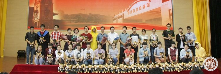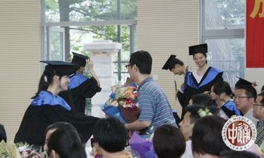 校领导、嘉宾、教师代表与获得特别毕业礼物的学生合影