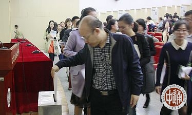 在语文学科洪兆颖、数学学科秦霞等18老师依次进行了个人述职之后,与会老师认真填写了测评表投入票箱。