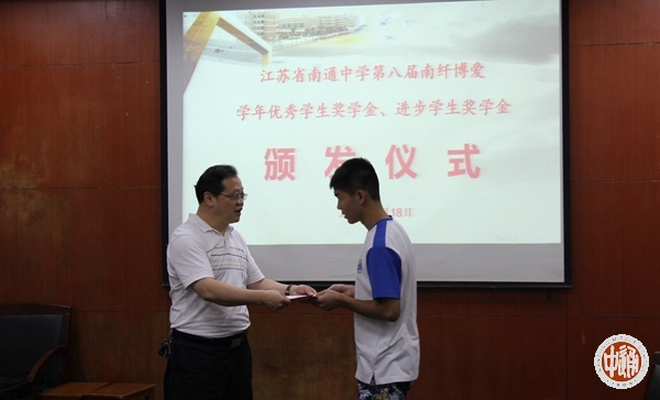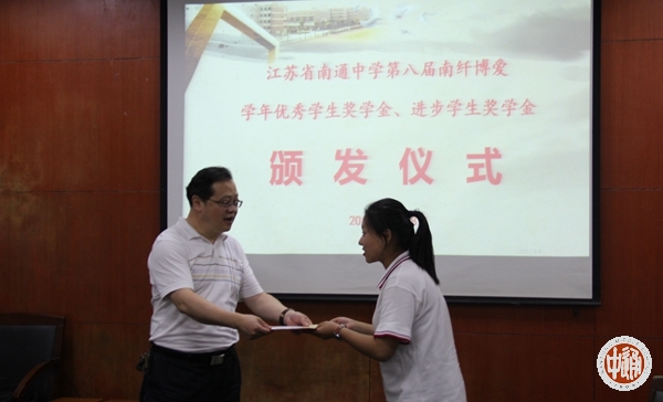 9月18日下午,我校第八届南纤博爱学年优秀学生奖颁奖活动在科学楼一会议室举行。2 016—2017学年度,我校学生诚于做人、恒于学问,一学年来一部分同学在全面发展的基础上,刻苦学习,成绩优秀,名列年级前茅,获得“学年度南纤博爱优秀学生奖学金”;一部分学生不畏困难,勇攀高峰,学习成绩进步显著,获得“学年度南纤博爱进步学生奖学金”。