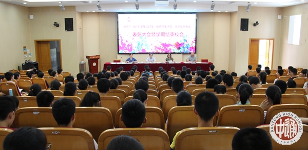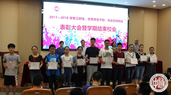6月30日上午,我校在科学楼三楼报告厅举行学年度优秀学生及先进班集体表彰大会,学生处主任滕旻彦主持并宣读表彰决定(附后),会上学生处邱允莉和潘雪峰副主任分别对本学期班会课、常规、社区及社团工作作了点评,对今后工作提出了解决问题的思路。会上特邀2018届优秀毕业生——省理科第二名范承志同学和省文科第五名石雨辰同学,就如何应对学科竞赛和过好暑期生活分别为学弟学妹作经验介绍。沈惠祥副校长到会讲话,肯定全校师生一学年以来取得的可喜成绩,并就暑假学习生活向同学们提出了希望和要求。