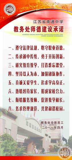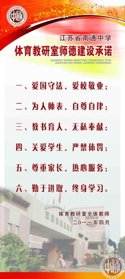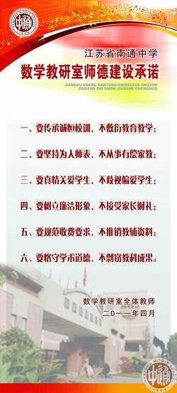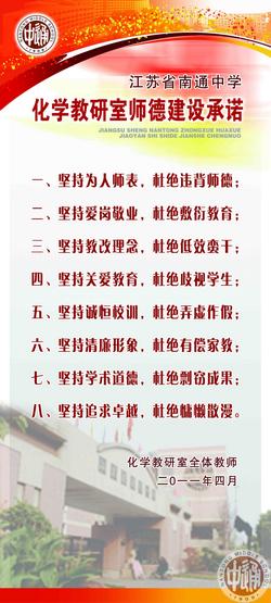 本月开始,我校践行师德创先争优活动进入推进阶段。在4月14日召开的南通市教育系统创先争优活动工作推进会上,省教育厅和市教育局的与会领导对具有我校教改特色的师德建设承诺和党员亮牌上岗等制度给予了充分肯定。左图是我校党员置于办公桌上的身份牌,正面内容是本人照片、姓名和岗位,以及警示语“讲党性,重品行,做表率”,背面是校党委对全体党员提出的基本要求“践行师德创先争优,办人民满意教育”。以下各图是学校和各部门各学科师德建设承诺,公示于校园接受全体师生监督。 |