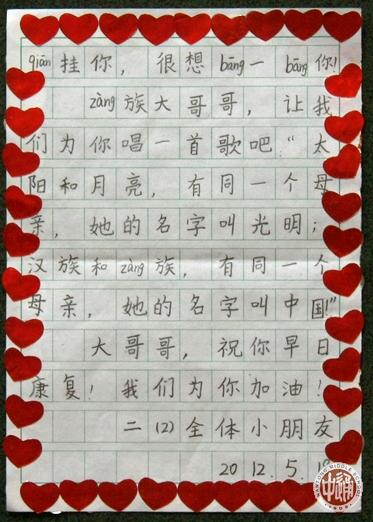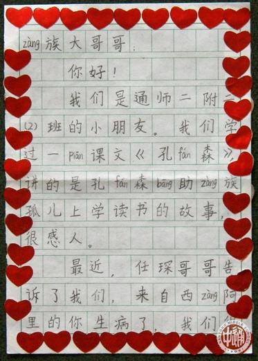 听说通中有个藏族大哥哥嘎玛旦增患重病住院,南通师范第二附属小学二年级2班的小朋友们也踊跃捐款。全班50个同学共捐了4296.80元,于5月18日下午委托张玺妮和徐霄扬两位同学亲自送到通中。两位小朋友还带来了一封信,是全班同学集体写给嘎玛旦增大哥哥的。