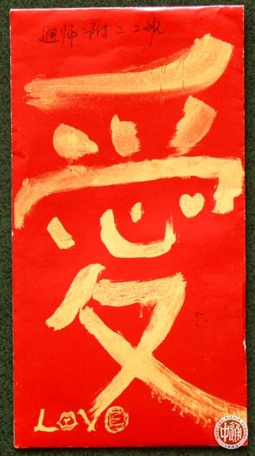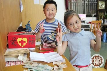 上图就是送来捐款的两位小朋友。左图是装着小朋友捐款的信封,上面一个大大的“爱”字。可能觉得中间的那个“心”特别感人吧,小朋友破例写了这个繁体字。下图我校校长姚天勇正在读小朋友的信,赞扬小朋友“太可爱了!”