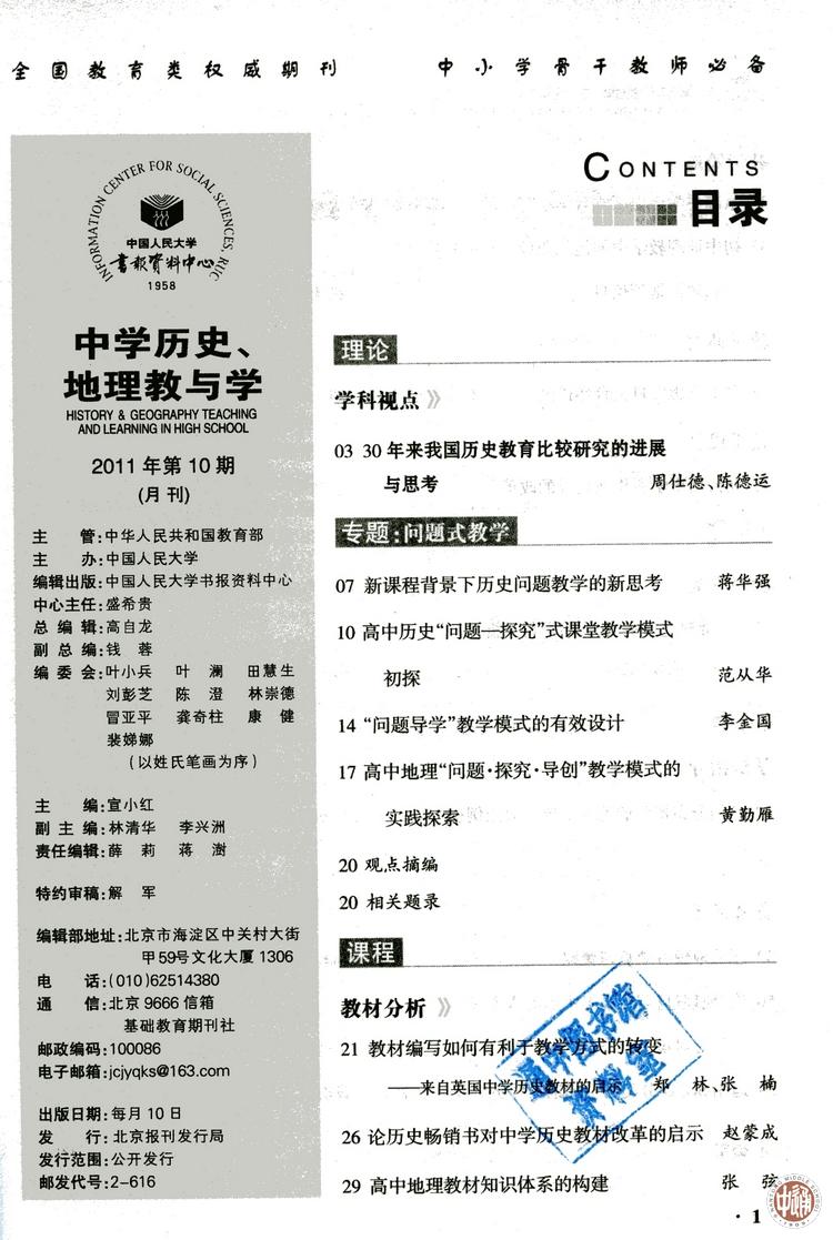 其中,范从华的《高中历史“问题—探究”式课堂教学模式初探》(原载《中学历史教学研究》2010.1/2.43~47)被全文转载于《中学历史、地理教与学》2011年第10期。 邬云琰《浅议史学研究成果在高中历史教学中的运用》(原载中文核心期刊《教学月刊:中学版》2011.11.5~7)被全文转载于《中学历史、地理教与学》2012年第2期。 陈建云《用有意义的问题引领课堂的实践与思考》(原载《中学历史教学参考》2011.12.53~55)被全文转载于《中学历史、地理教与学》2012年第5期。 《人大复印报刊资料》系列杂志与北大中文核心和南大社科核心不同,它的数据库以其涵盖面广、信息量大、分类科学、筛选严谨、结构合理完备,而成为国内最有权威的,具有大型、集中、系统、连续和灵活五大特点的社会科学、人文科学专题文献资料宝库。我国各大高校及科研单位都以本年度论文被《人大复印报刊资料》转载数量之多为荣。人大复印资料收录的论文数量不仅是高校学术排名的重要指标,也是原载文期刊被遴选为全国中文核心期刊的重要依据。 |