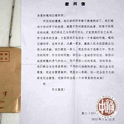 5月19日下午,学生会高一分会五名成员及团委老师前往通大附院看望身患骨癌的嘎玛旦增同学,带去了全校同学写给他的慰问信,此外还有华西村的老村长、通师二附小朋友以及一些陌生人写来的信。这些信包含着所有人对他的浓浓关心,嘎玛同学的脸上洋溢起了满足的微笑。