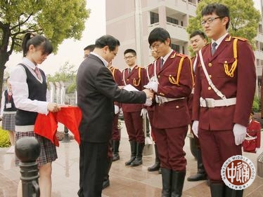 在高一年级国旗班的同学们完成在南通中学的首次升旗仪式后,包涵(上左图)和孙灿(上右图)两位同学代表结束了三年护旗、升旗任务的高三国旗班和新一届国旗班分别发言,校党委书记韩明飞(下左图)和副校长沈惠祥(下右图)为高三国旗班全体成员颁发了荣誉证书,高一国旗班的曹佳懿同学从高三国旗班班长朱成亦同学手中接过象征责任和坚持的国旗,完成了国旗班的新老交接。