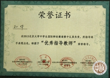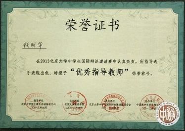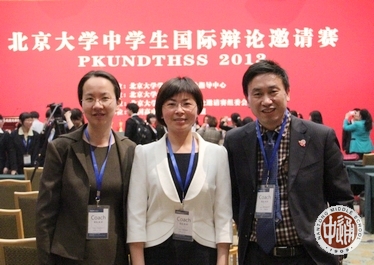在2013北京大学中学生国际辩论邀请赛中,因指导的参赛学生表现出色,我校钱明华老师(下图合影右)、张云老师(中)、孙晔老师(左)均获得“优秀指导教师”荣誉称号。