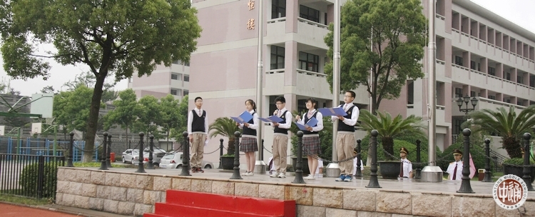 国旗下演讲主题是:追梦六月,再创辉煌。演讲者(下图左起):成琳、朱沛林、陆昳睿、张家豪。全文如下。